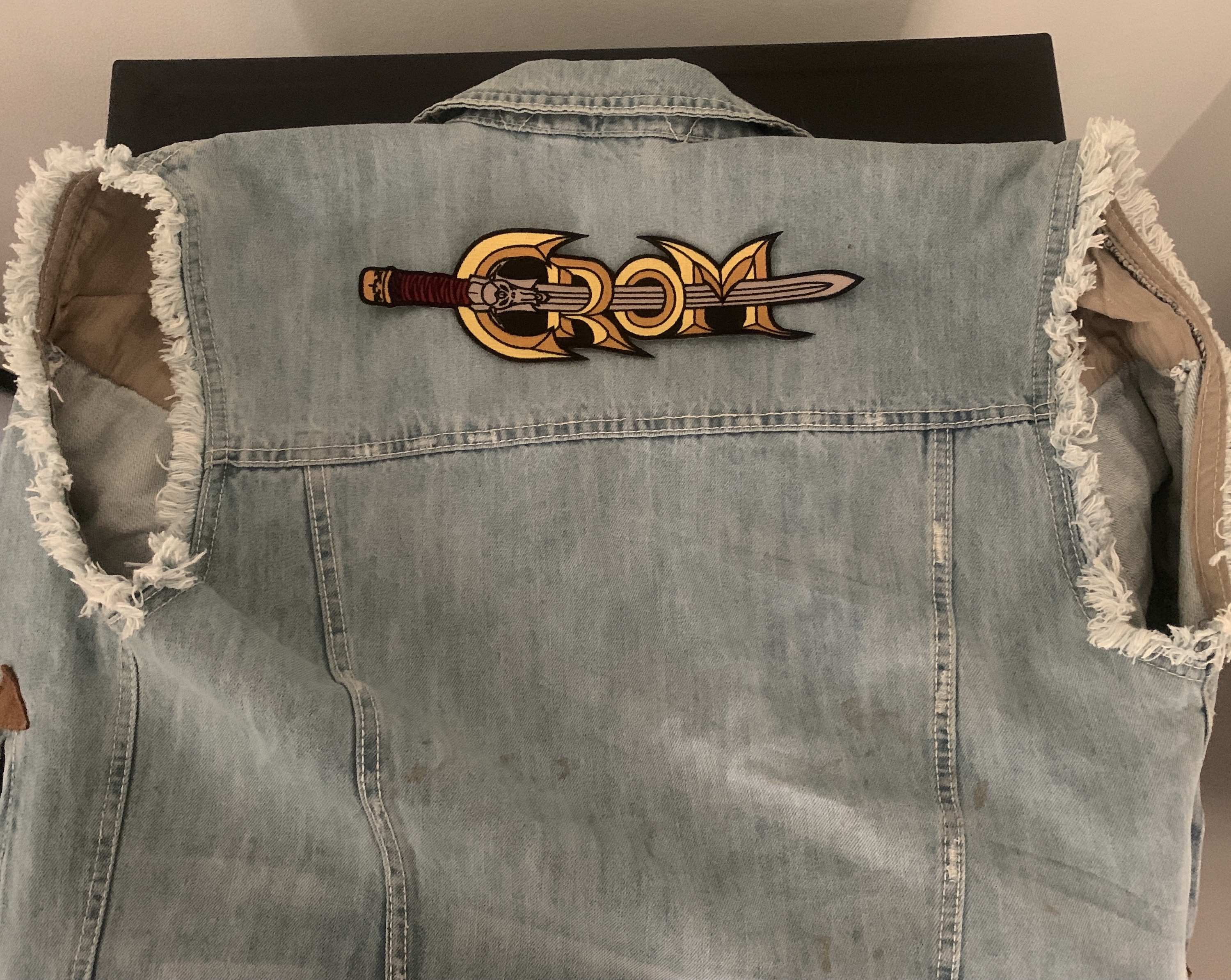 This full color embroidered patch is 10.5” x 3.25” and fits perfectly across the top of your battle vest. Picture is shown with sleeveless acid washed denim jacket for proper placement.