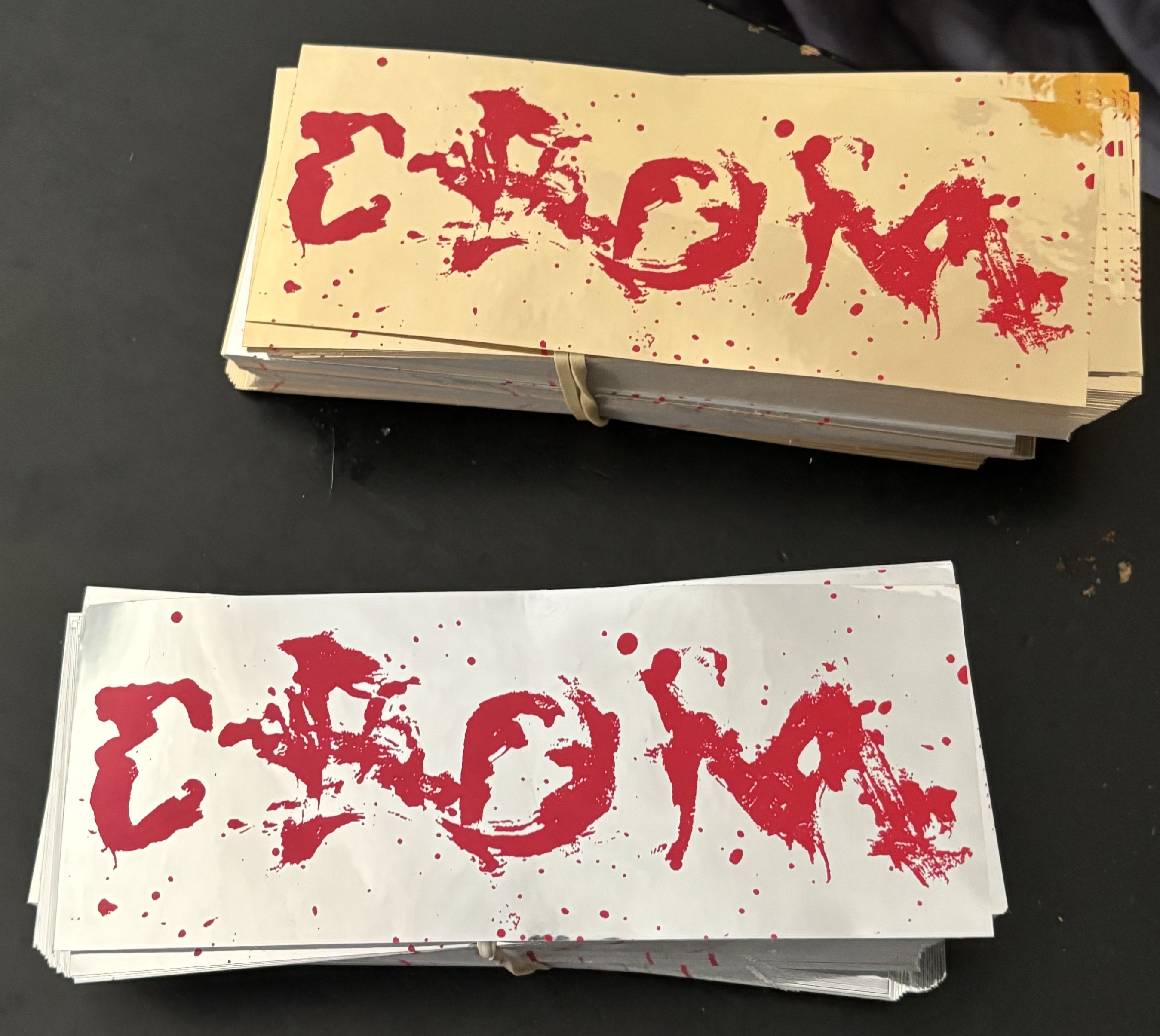 Crom blood splattered logo sticker comes in two colors: metallic gold and metallic silver. Choose wisely.